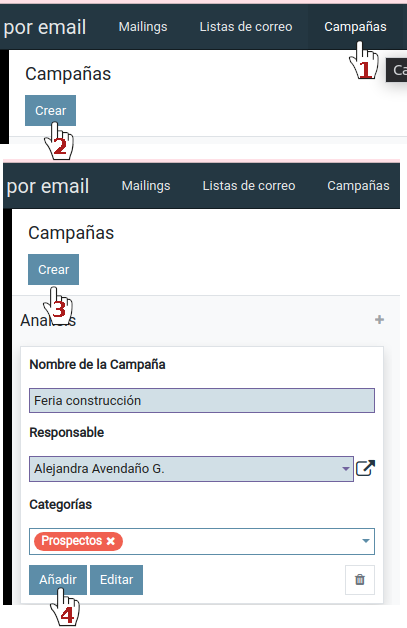 Desde el menú principal del módulo de Marketing por email, de click en el botón Campañas (1), luego click en Crear (2)