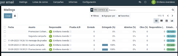 Un resumen general de todos sus envíos masivos, con su respectivo progreso, los puede ver dando click en el botón Mailings, del menu principal.
